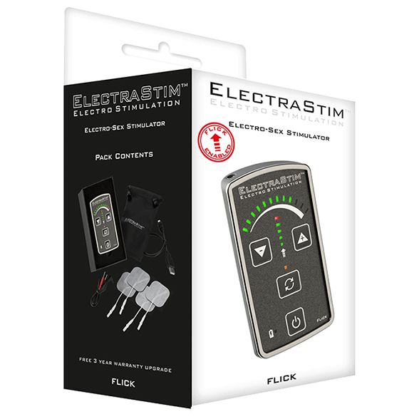 Smaller, slimmer, and sexier, ElectraStim Flick has 7 stimulation settings with escalating patterns and pulsations, each operable at 24 intensity settings to suit your tastes. As if that wasn’t enough, the patented Flick feature offers rhythmic stimulation in sympathy with your hand movements for a completely tailored electro-play experience.