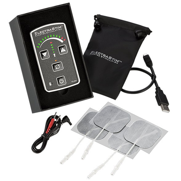 This electro sex beginner’s pack includes the single-channel EM60 Flick unit, 4 ElectraPads, a connecting wire with 2x 2mm pin connectors, a USB charging cable, a storage pouch, instructions, and a 1-year warranty