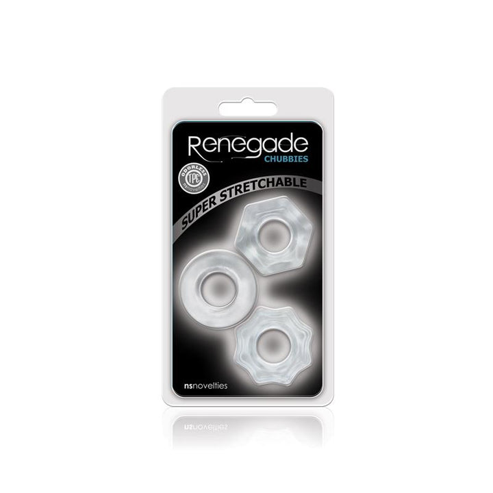 Comfort and control delivered by Renegade Chubbies. Super elastic, these stackable rings have multiple uses. Body safe TPE is suitable with all lubricants.