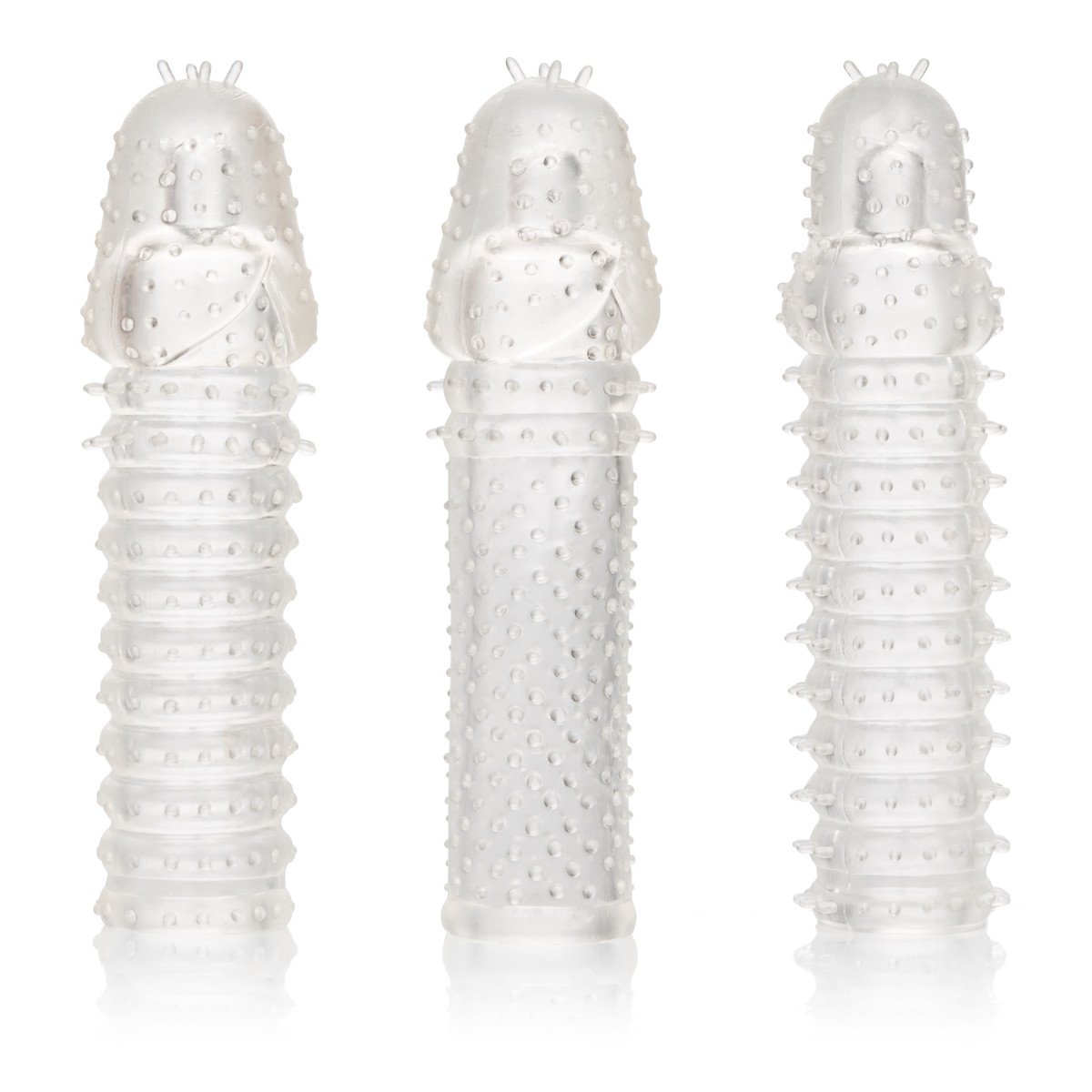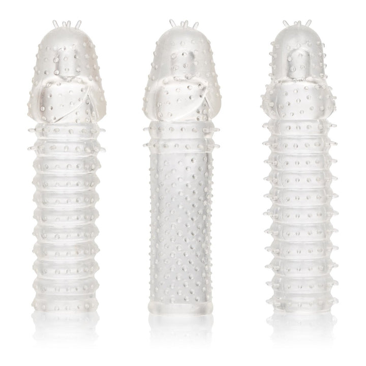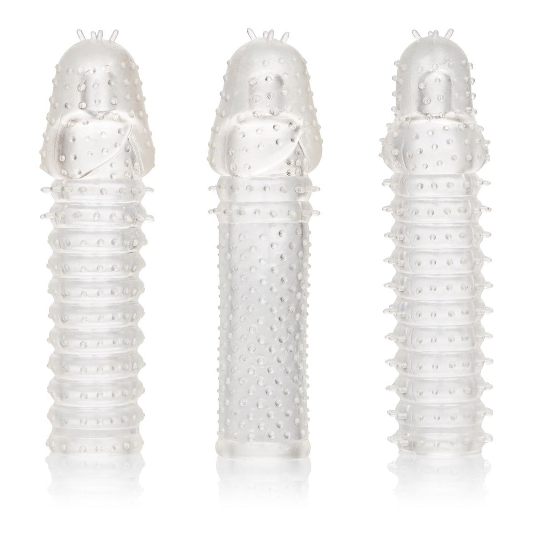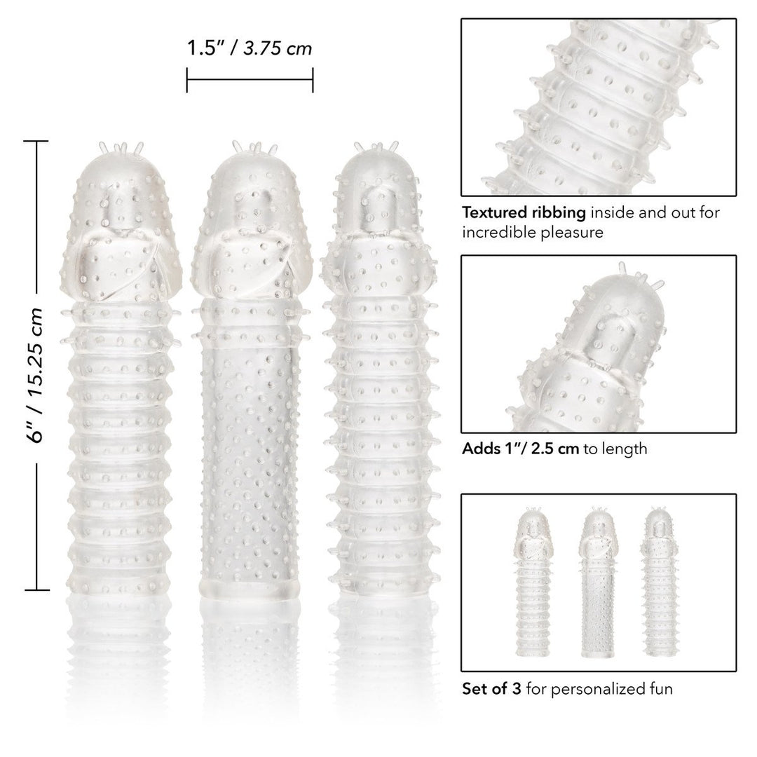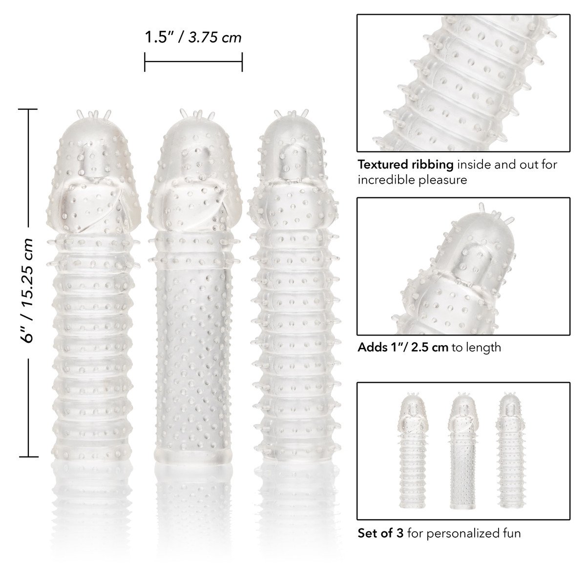 The 3 Piece Extension Kit is a set of 3 super tight, close-end extension sleeves with a ribbed texture inside and out for intense stimulation. These enlarging enhancer sleeves wrap tight to increase girth, length and explosive pleasure for everyone involved. The erotic enhancer sleeve’s ultra stretchy material and spacious chamber is made to fit even the biggest man. While you thrill your lover with increased girth and stimulating ticklers, the fulfilling enhancer’s powerful erection support and textured chamber result in explosive results for both of you. The textured chamber and erection enhancer provide increase stimulation and powerful support. Wrap your pleasure tool in this super stretchy sleeve to easily increase stamina, stimulation and orgasmic pleasure. The flexible enhancer is made from a hygienically superior TPR. This body safe material is unscented and phthalate free to keep your most sensitive spots happy and healthy.