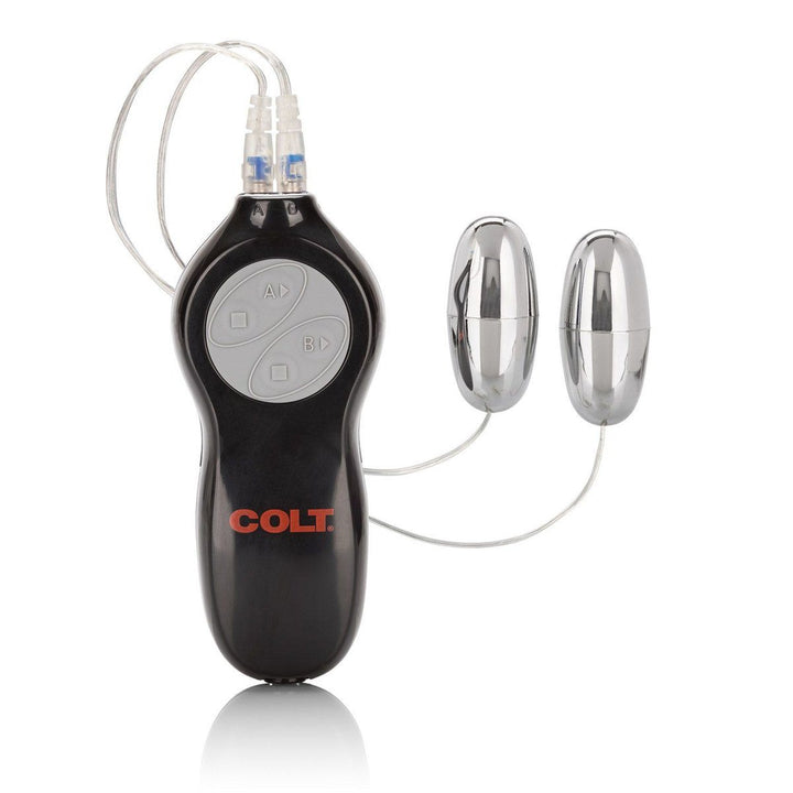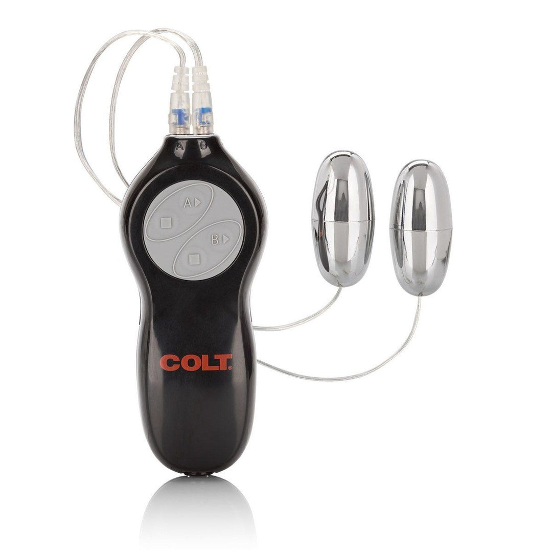 The COLT 7- Function Twin Turbo Bullet™ is a supremely powerful, extremely versatile, independently controlled stimulator set with plug-in jacks. Offering seven functions of vibration, pulsation, and escalation, you’ll experience superior gratification with these sleek black and silver bullet vibes. Featuring an easy push-button control with a simple on/off, using this sex toy is as simple as it is pleasurable. The ABS with silver plated bullets and ABS controller are crafted with high-quality material and care, so you’ll be as safe as you are satisfied when enjoying these bullet vibes. For incredible sensation, add a playful vibrating bullet to your sex toy collection. You’ll find fulfilment with ease, whether you use the COLT 7- Function Twin Turbo Bullet™ solo or with a partner.