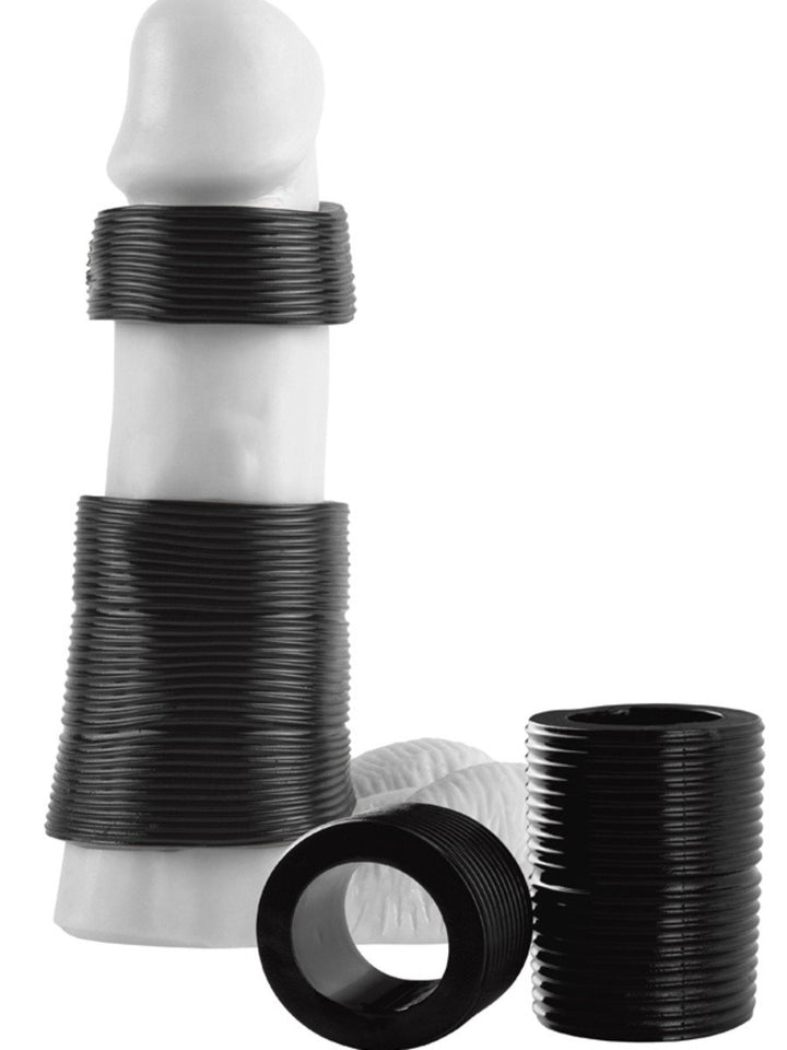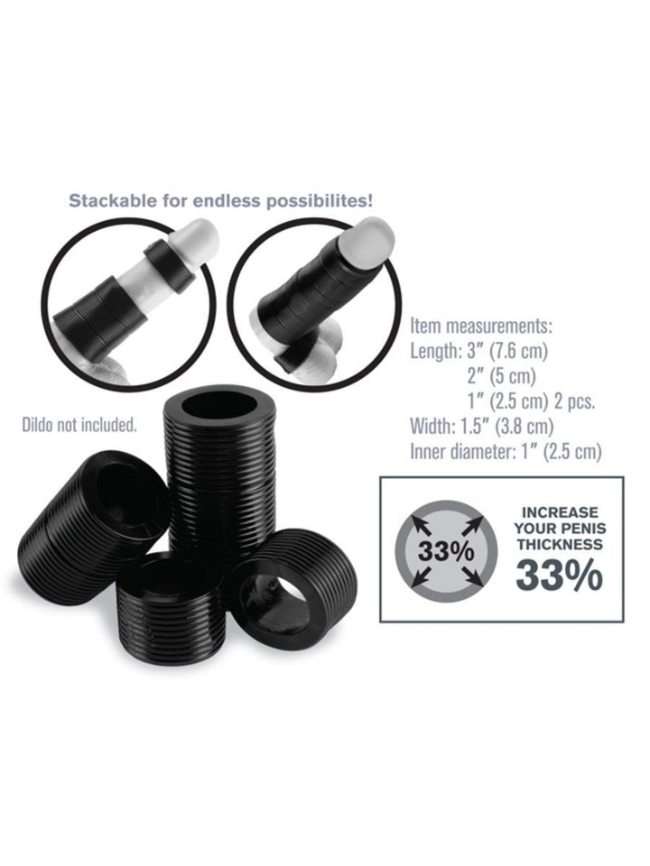 The Girth Gainer System is a set of 4 TPR sleeves and rings designed to give you the thickness you've always dreamt of. With a 3-inch sleeve, a 2-inch sleeve, and two 1-inch rings, the customizable system allows you to create the do-it-yourself dick of your dreams! Stack the sleeves on your pleasure rod and increase your thickness by 33% all around! The ribbed sleeves provide extra stimulation for your partner, while they help the wearer maintain firm erections and extend the fun. Use them as a ball cinch to prolong ejaculation and enjoy explosive climaxes when the moment is right. With multiple combinations to choose from, the pleasure possibilities are endless!