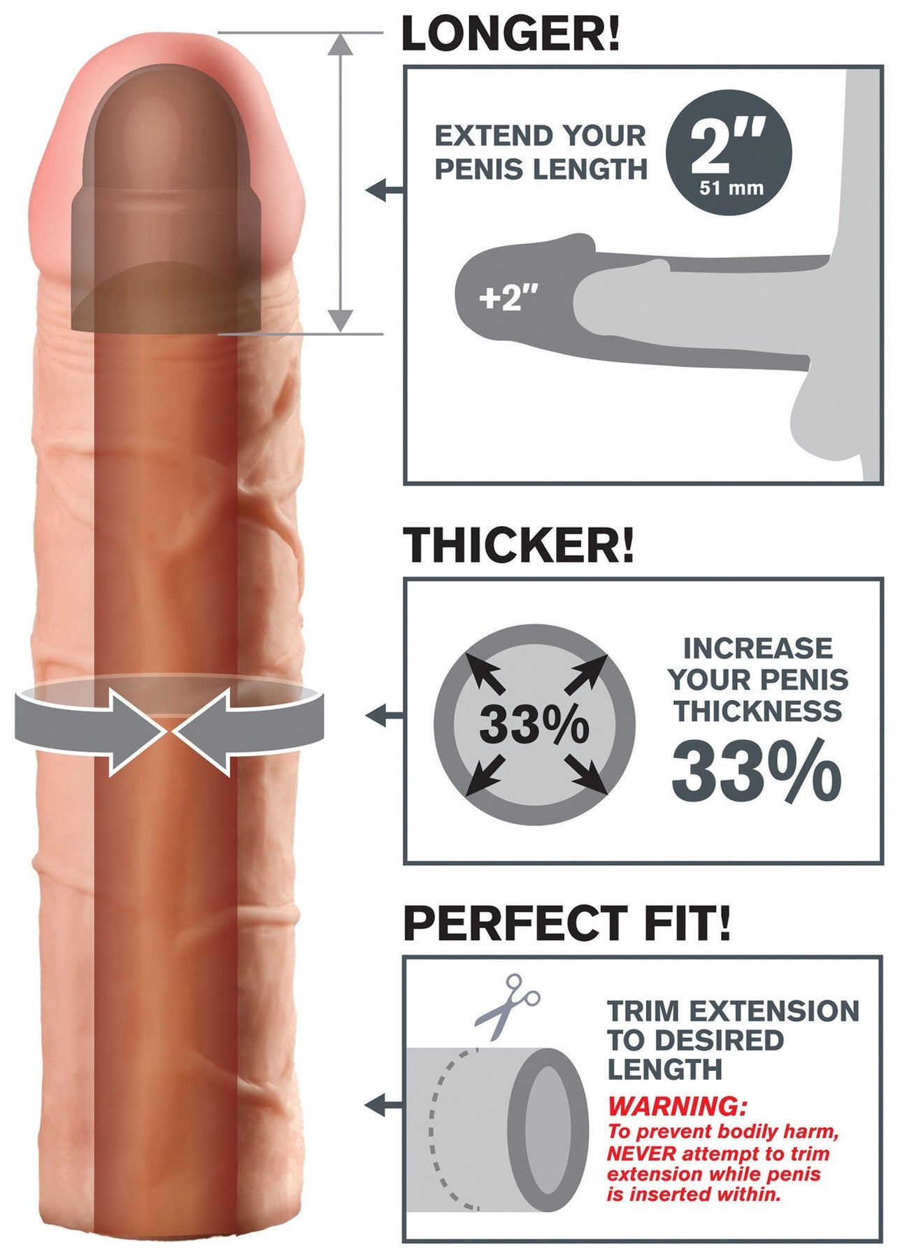 The Perfect 2 Extension is a customisable extension that can be easily trimmed at the base for a perfect fit. Its super-stretchy to accommodate most sizes and snug enough to help you last longer. Your partner will enjoy deeper penetration with the 2 extension at the tip, while the ultra-lifelike shaft makes you 33% thicker all around. The soft Fanta Flesh material feels just like a second skin, giving you the length, girth, and confidence you need to satisfy your lover.