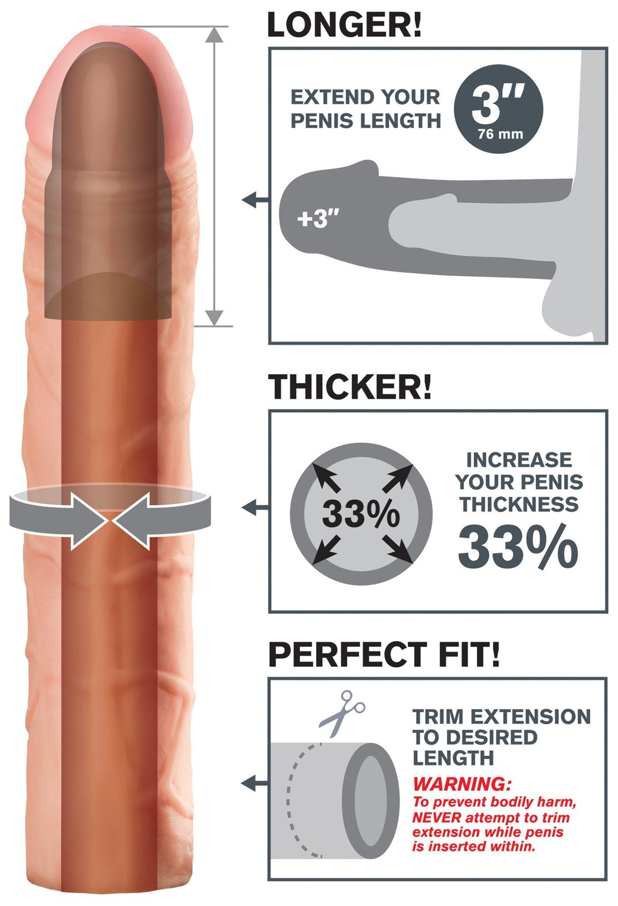 The Perfect 3 Extension is a customisable extension that can be easily trimmed at the base for a perfect fit. Its super-stretchy to accommodate most sizes and snug enough to help you last longer. Your partner will enjoy deeper penetration with the 3 extension at the tip, while the ultra-lifelike shaft makes you 33% thicker all around. The soft Fanta Flesh material feels just like a second skin, giving you the length, girth, and confidence you need to satisfy your lover.
