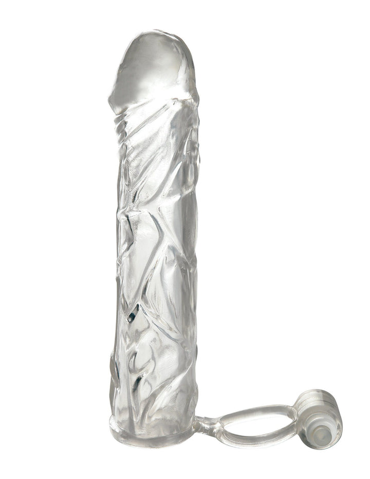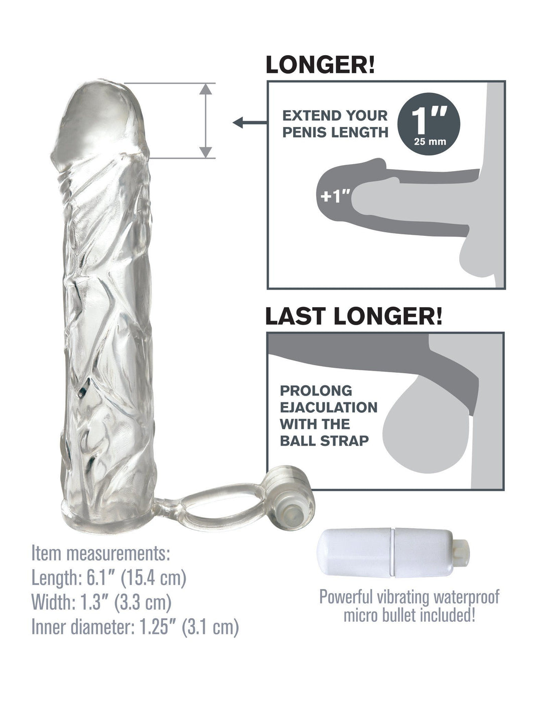 The Vibrating Super Sleeve is a lifelike textured extension that gives you the girth, length, and confidence to satisfy your lover. It's super-stretchy to accommodate most sizes and snug enough to help you last longer. The ball strap holds the extension in place, prolongs ejaculation, and features a powerful micro vibe for explosive climaxes. Your partner will enjoy deeper penetration with the 1″ extension at the tip, while you watch your dick grow bigger and thicker than ever before through the crystal-clear sleeve! Try it in the shower or spa and turn bath time into pleasure time!