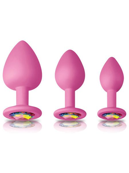 Enjoy backdoor bling with Glam’s three-piece set of bejewelled silicone plugs. Elegantly crafted, each is shaped for comfort and fun and adorned with a sparkling rainbow gem.
