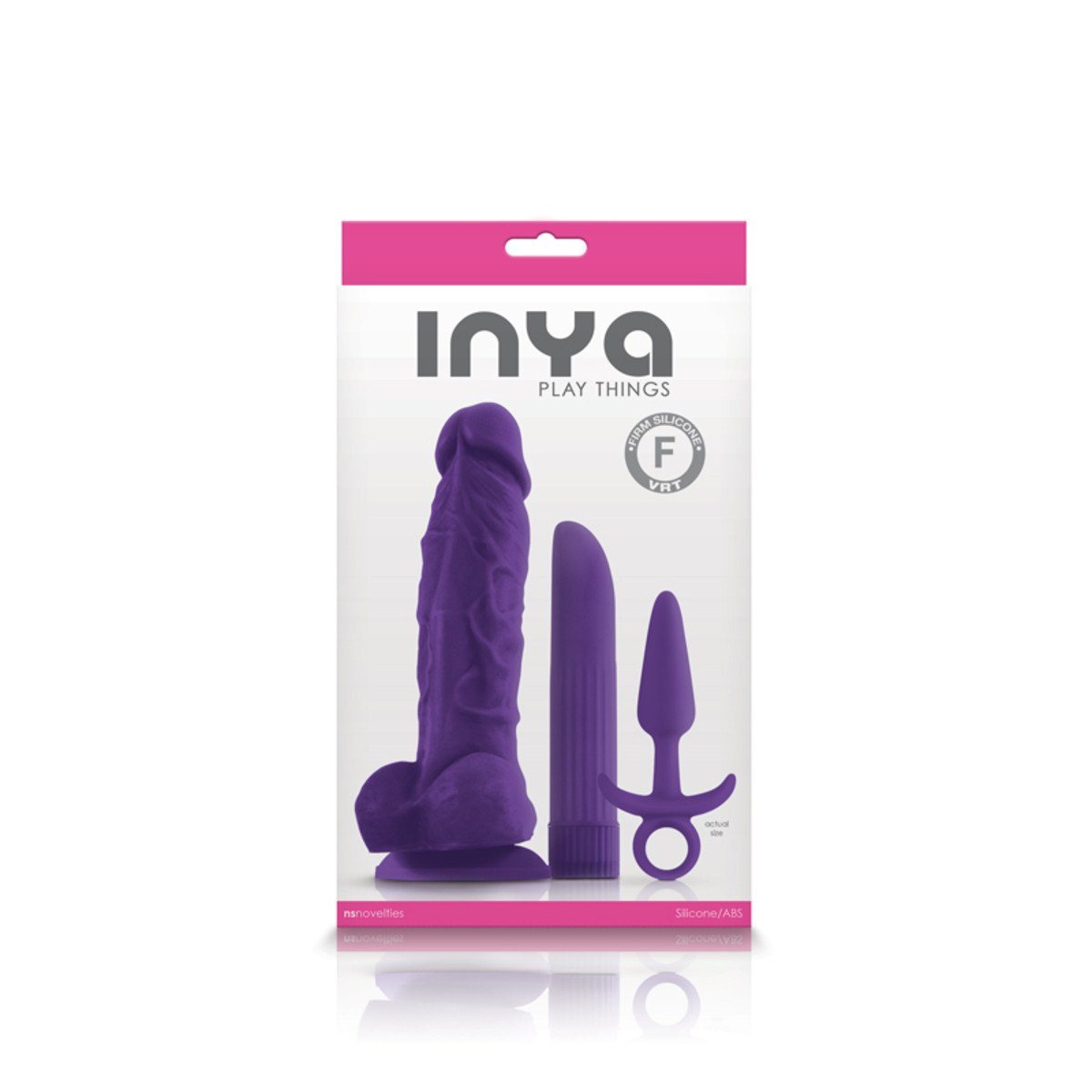 Playtime is always better with INYA Play Things – a provocative and vibrant collection of high-end pleasure products! This must-have kit includes realistically moulded 5-inch silicone dildo with strong suction cup base, powerful 5-inch ABS vibrator, and stylish, slim-tapered 3-inch silicone pleasure plug. Let the games begin! Available in pink and purple sets.