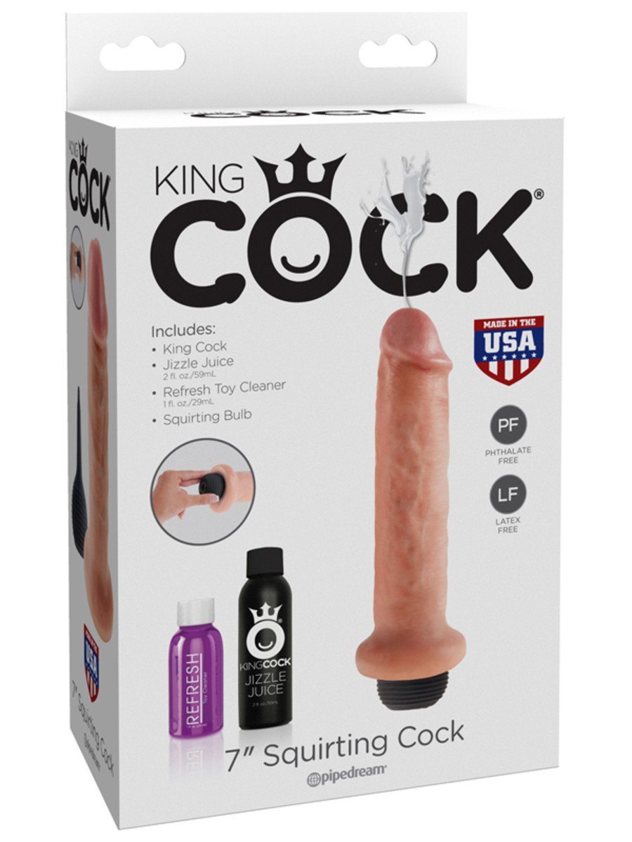 This King Cock Squirting Cock is ultra-realistic and will satisfy all of your cravings for cum-play! Hand-sculpted with amazing attention to detail and featuring our exclusive Jizzle Juice squeeze-bulb, the King Cock Squirting Cocks are the most satisfying ejaculating dildos on the market! Every King Cock is phthalate-free, latex-free, body-safe, hypoallergenic, and proudly made in the USA.