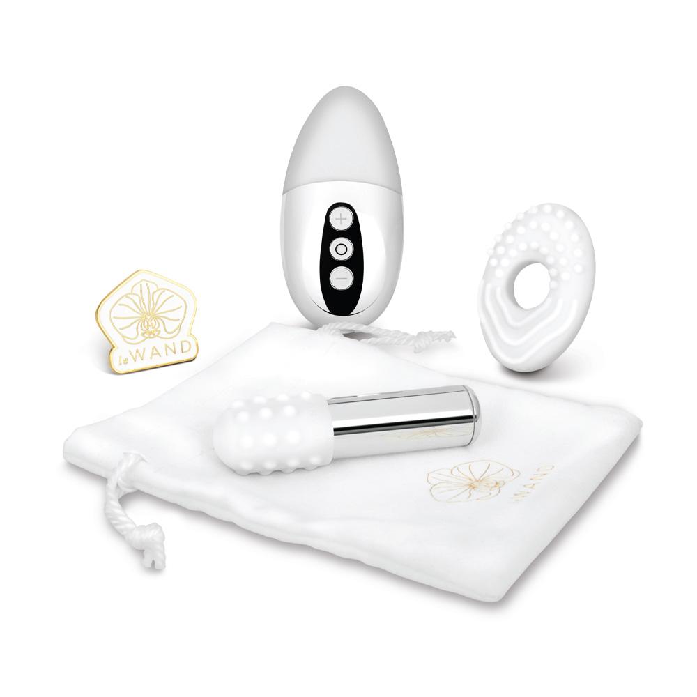 Sex-positive holiday vibes a ringing with 4 Special Edition accessories including a silicone texture cover, silicone texture ring, Le Wand Orchid enamel pin and velvety storage bag.