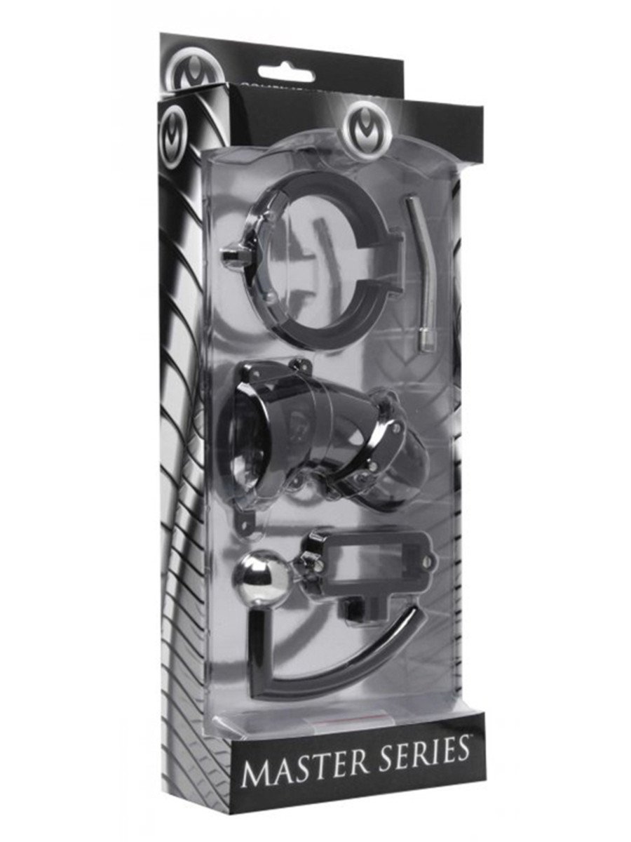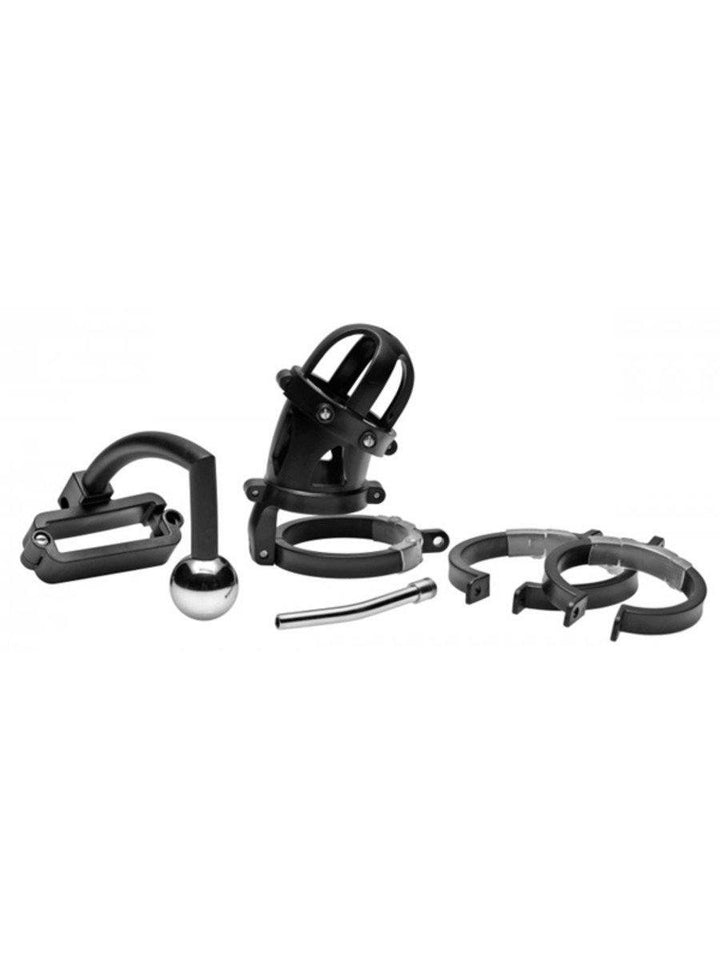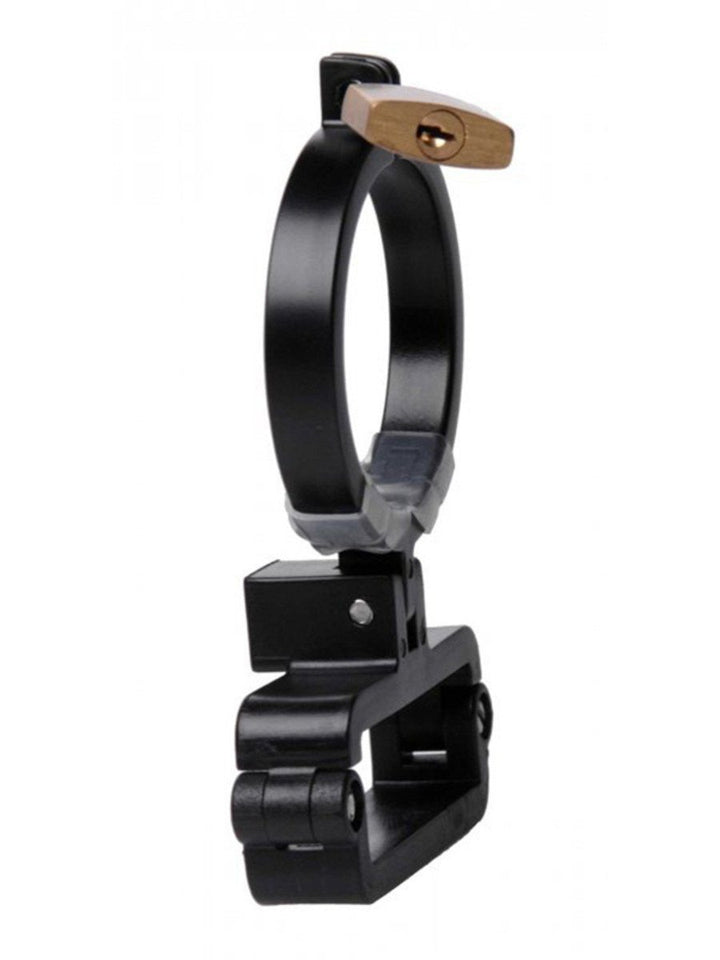 Keep him supremely locked into submission with this extreme chastity cage by choosing one of the three graduated rings to fit over the cock and balls, then fitting the cage over the penis shaft. Now is where the fun begins. You can choose if you want him to wear the removable cum-thru urethral plug, the detachable anal hook with stimulator, and detachable ball clamp. Each ring has a soft rubber sleeve at the hinge, to avoid pinching and for added comfort. This device secures with a flat head screwdriver. In addition to being used for chastity, this versatile toy can also be used without the cage. Just secure the top of the ring with one of our brass locks, and this device turns into a cock ring that you can hook your accessories to! Use the attached ball clamp alone or with the insertable arm. . Is it reward? It is your domain...you decide.