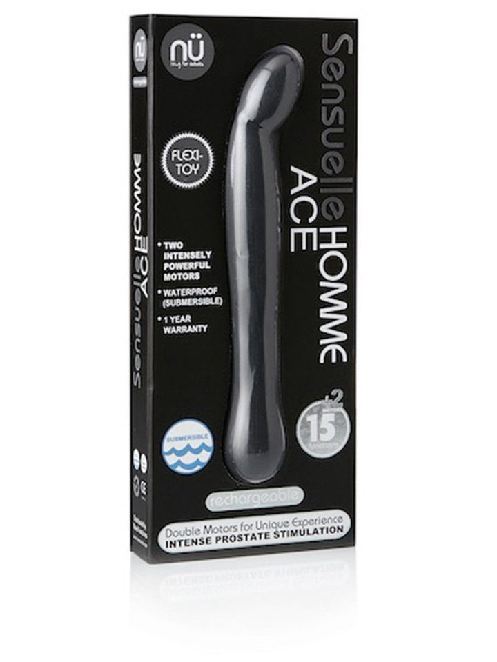 The NU Sensuelle Homme Ace is a Flexible Vibrating Prostate Massager and is fully USB Rechargeable for extended playtime. The Ace has a smooth silicone body contains two powerful motors. The motor in the head massagers your prostate while the 2nd motor in the base provides intense anal stimulation. Ace is flexible and comfortable to use. When your body moves, Ace moves with you. The POWERFUL dual motors provide 15 functions of vibration, escalation, and pulsation. You control Ace by pushbutton controls in the base. The USB rechargeable Sensuelle Homme Ace is submersible for fun in & out of the water and easy cleanup.