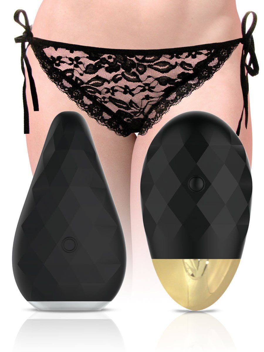 The Playful Diamonds Lady triangle shaped vibe fits perfectly within the lace panty, while the two soft nubs nestle against your clitoris.