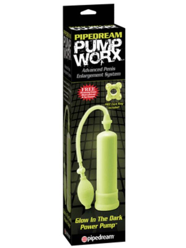 Turn off the lights turn on the fun and watch your cock grow as it glows! The Glow-in-the-Dark power Pump will give you the size and confidence you've always dreamt about without any harmful side effects. With each squeeze of the medical-style pump ball your pleasure rod will grow bigger thicker and swell with power. Once you penetrate the smooth PVC opening you'll quickly discover throbbing rock-hard erections that feel great and last and last with no midway performance letdowns. The soft PVC sleeve forms a perfect air-tight seal with your skin creating a strong vacuum inside the chamber that delivers maximum results. When you've reached your desired size just push the quick-release valve to reduce the suction and relieve the pressure. To prolong ejaculation slide the included enhancement ring over your shaft until it's nice and snug. The tight squeeze will prolong cumming help maintain your erection and extend the fun.