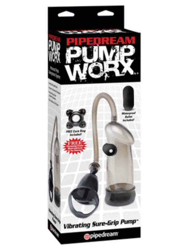The Vibrating Sure Grip Pump will give you the size and confidence you've always dreamt about without any harmful side effects. With each squeeze of the EZ-Grip pump trigger your pleasure rod will grow bigger thicker and swell with power. Once you penetrate the smooth flexible PVC opening you'll quickly discover throbbing rock-hard erections that feel great and last and last with no midway performance letdowns! The clear vacuum tube allows you to watch your cock grow and the quick-release valve relieves pressure with a push of the button. Turn on the powerful vibrating mini bullet and enjoy extra stimulation while you pump up your pleasure rod or remove the bullet and use it for extra stimulation elsewhere. To prolong ejaculation slide the included enhancement ring over your shaft until it's nice and snug. The tight squeeze will prolong cumming help maintain your erection and extend the fun. When you're done simply detach the cylinder from the vacuum hose and restore it to like-new quality with Pump Worx Toy Cleaner and warm water.