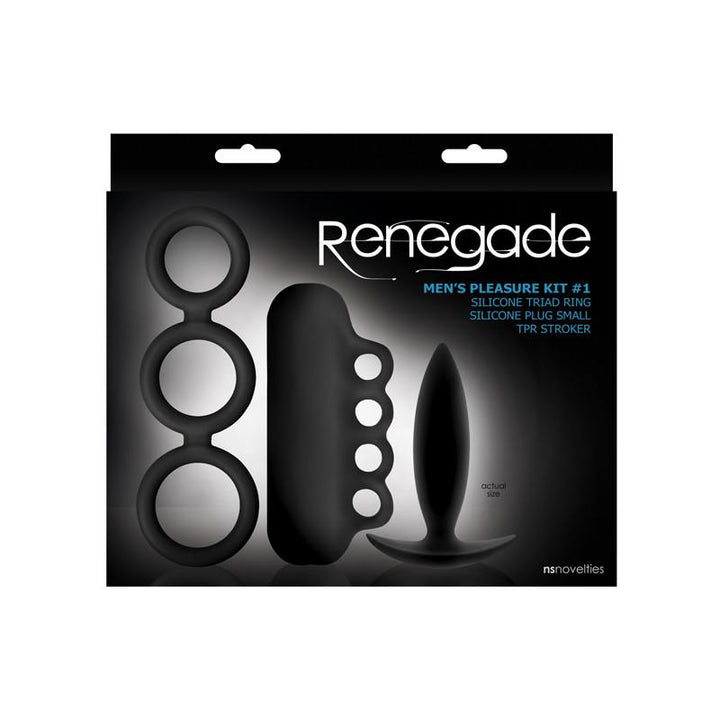 Wrap, plug and stroke your way to a mind blowing experience with Renegade's Men's Pleasure Kit. Triad Rings are super stretchy silicone rings bound together to restrict yourself in the most pleasurable ways. Made of firm, smooth medical grade silicone, Spades plug flare at the bottom for safe and fun play. Clamp your fingers tightly around the Handy Stroker and have yourself a go. Made with body-safe TPR. Use all three at the same time and learn what real pleasure is all about. Suitable with all lubricants.