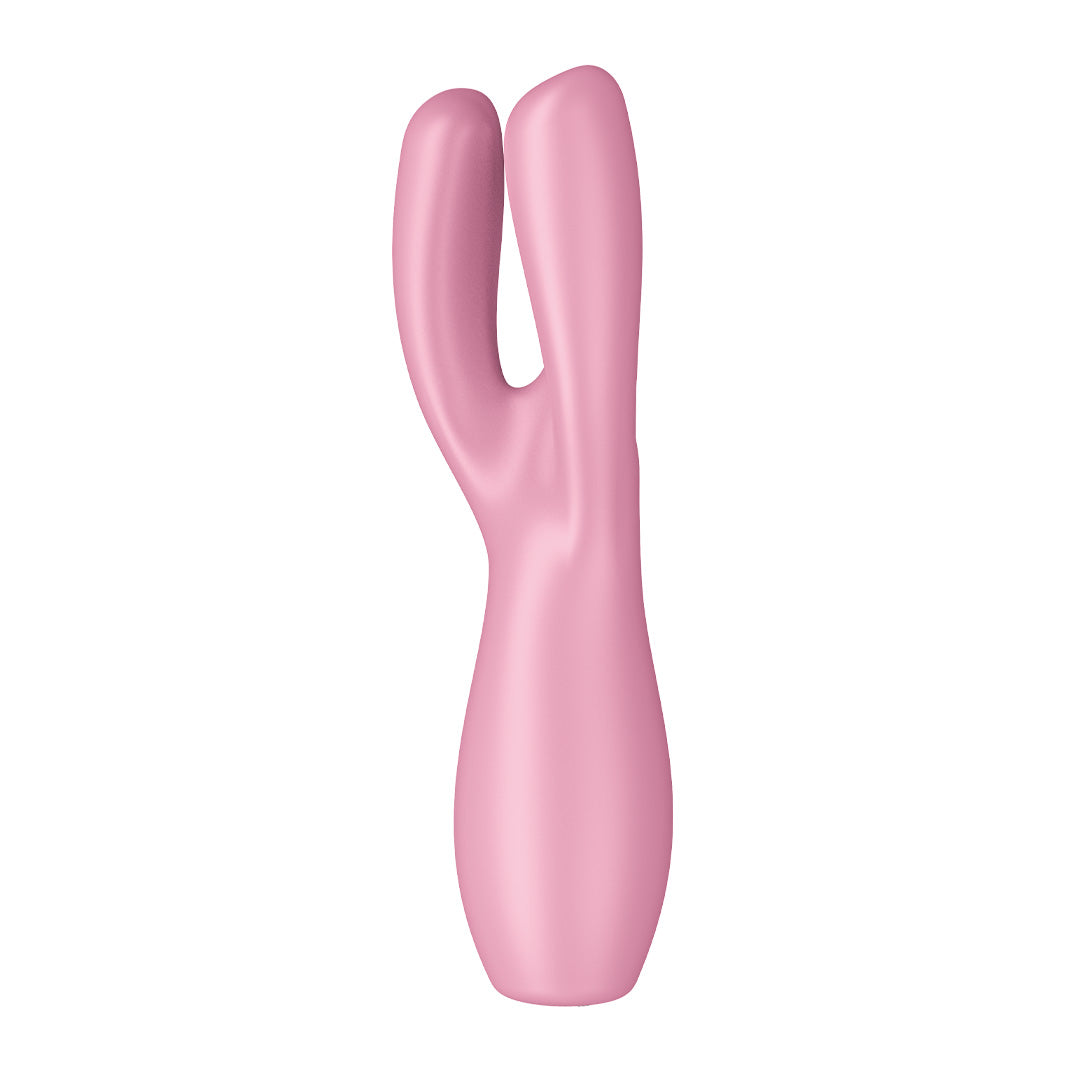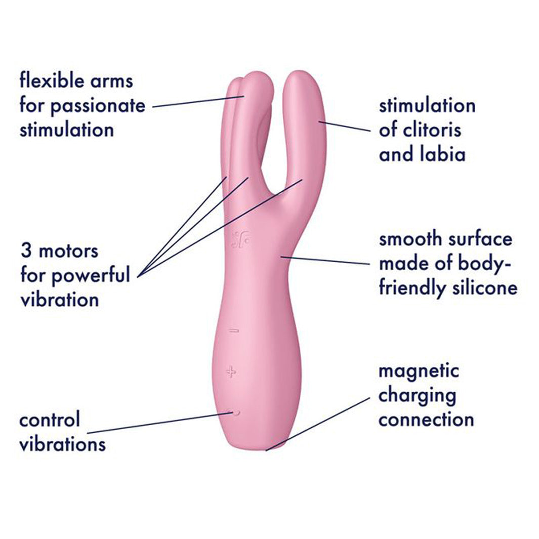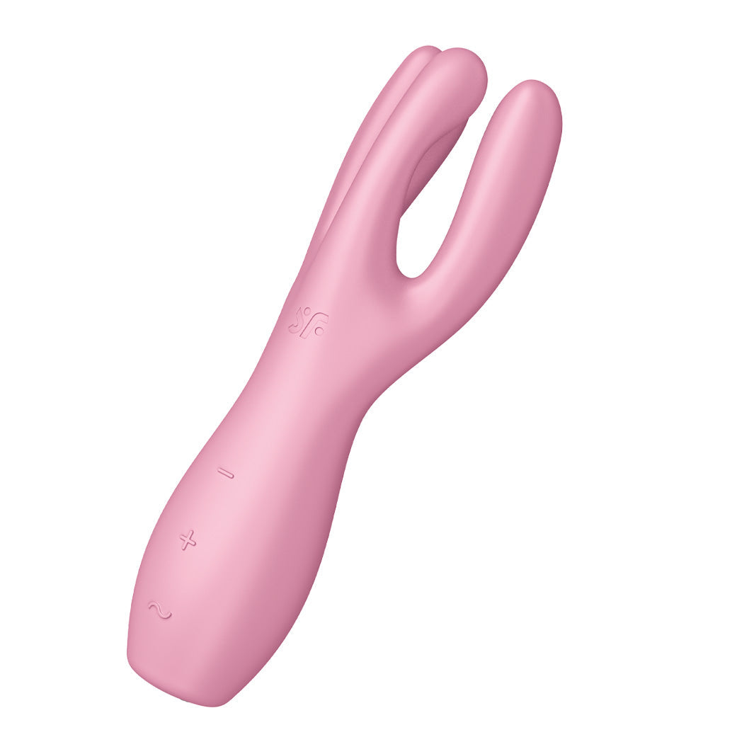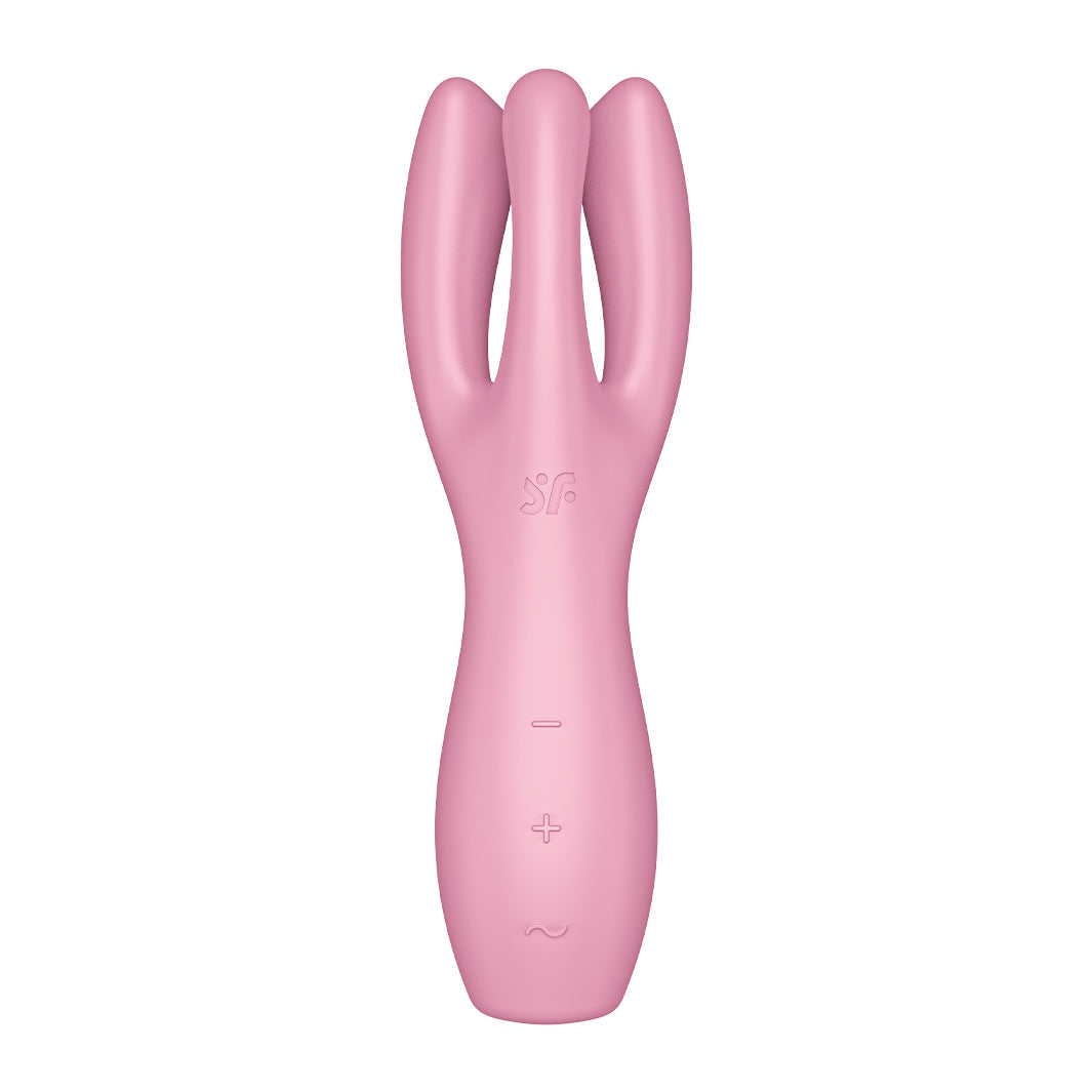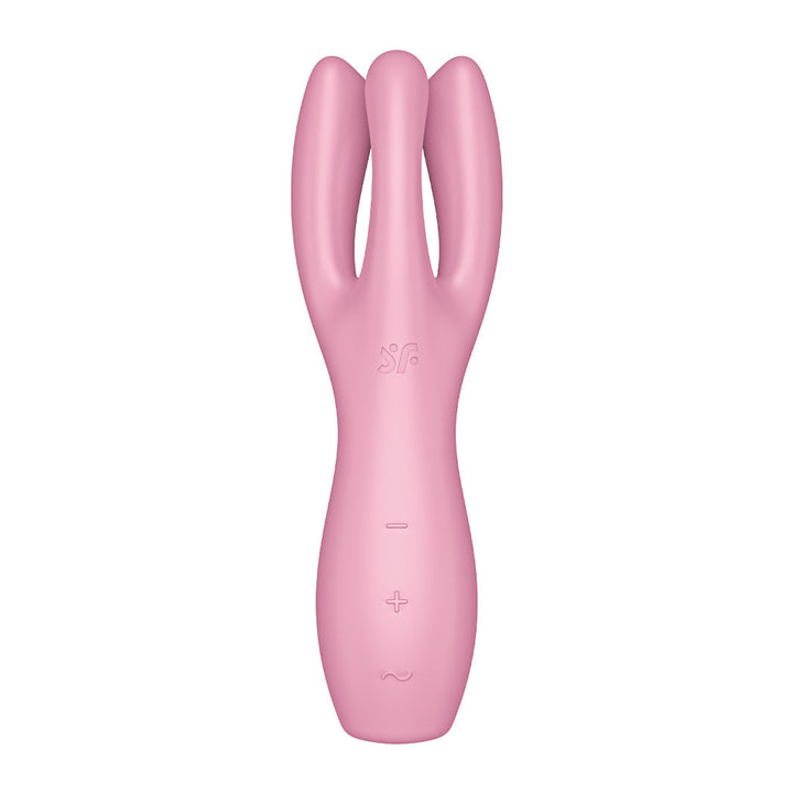 Welcome to Satisfyer Threesome 3! Adjust the flexible arms to stimulate multiple different erogenous zones with ease. Experience broad and targeted stimulation with arms built to hit all the right spots! Use the smaller, rounded, arms for centered stimulation. With 3 powerful motors, one located in each arm, choose from 12 different vibration programs easily through the intuitive control panel. Use the +/- buttons to control the programs of the outer arms, and the ~ to control the middle arm.