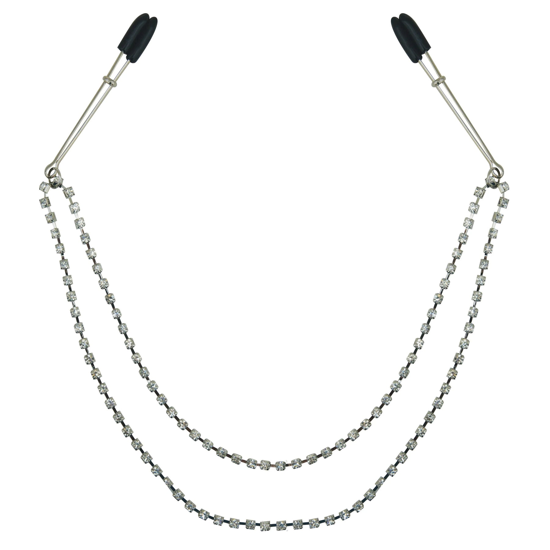 Style, grace, and amazing taste...all qualities of your dearly beloved. So why not compliment the treasures of their chest with a little more glittering adornment? Double your dangle as you leave your lover's nipples strangled. These tweezer-style clamps are easy-to-use and give you complete control of their tightness. The gentle rubber nubs ensure that this chest accessory remains comfortable and secure even during vigorous play.