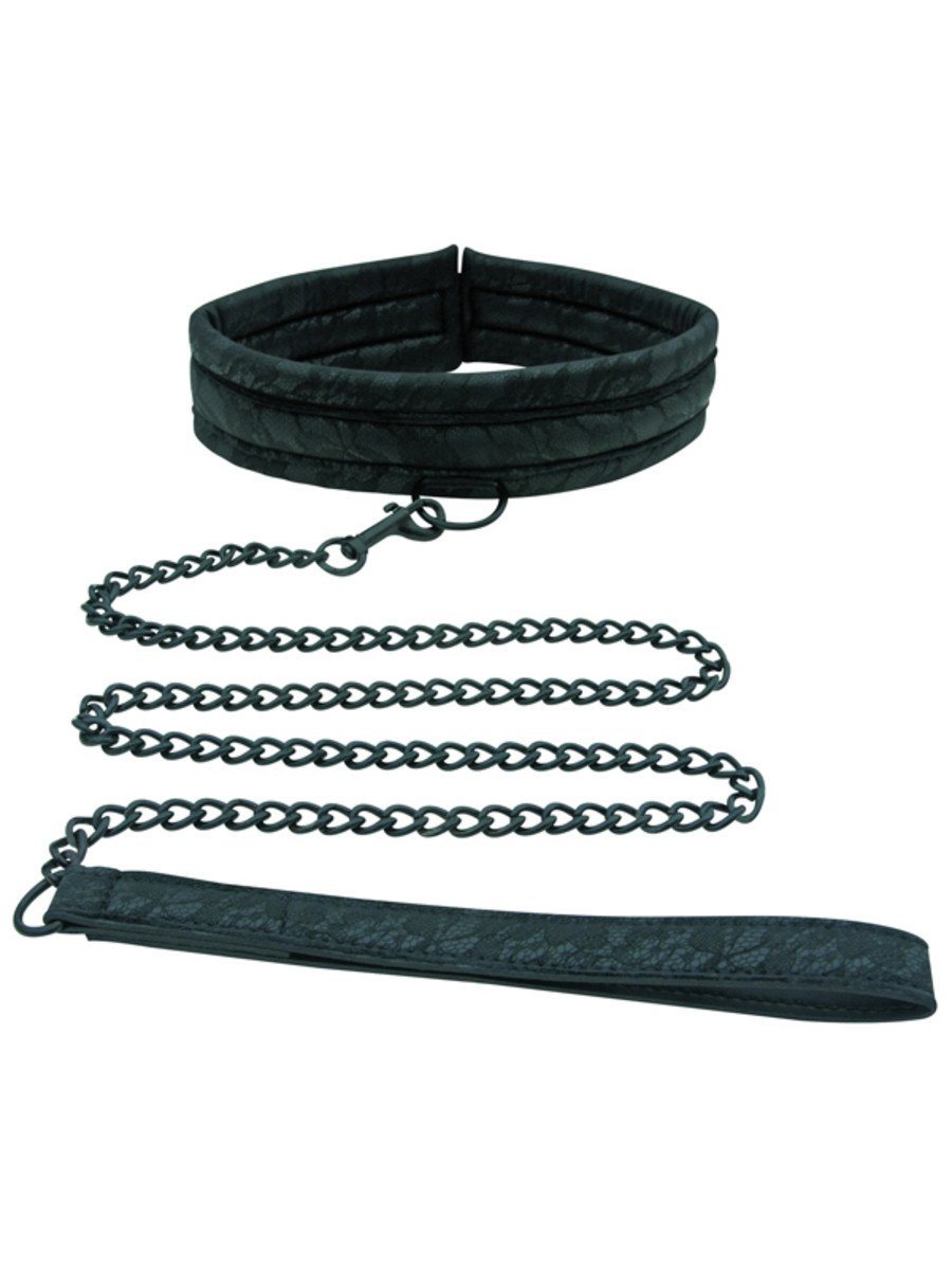 Attach the leash to the collar by hooking the end of the chain onto the collar’s corresponding loop. The lace-embossed handle lets you lead your pet around through all sorts of kinky encounters.