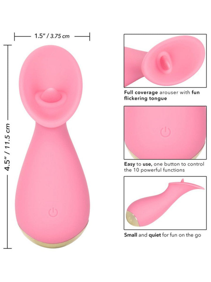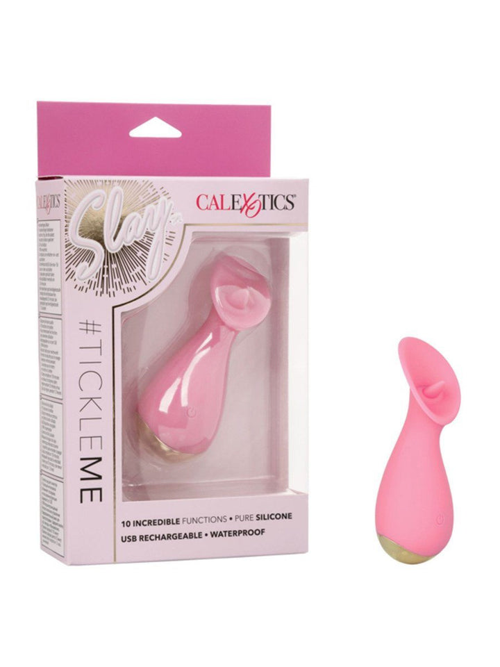 Slip the tickling Slay™ #TickleMe into your purse or handbag for knee-shaking pleasure wherever you go. The petite arouser fits between your fingers to let you deliver pinpoint tantalization and thrill with flickering vibrations. Get playful while you flicker through 10 indulgent vibration, pulsation and escalation functions with the easy-touch control button. The ultra-plush, full coverage arouser and flickering tongue-like teaser are great for exploring sensual sweet spots and intimate pleasure points with ease.
