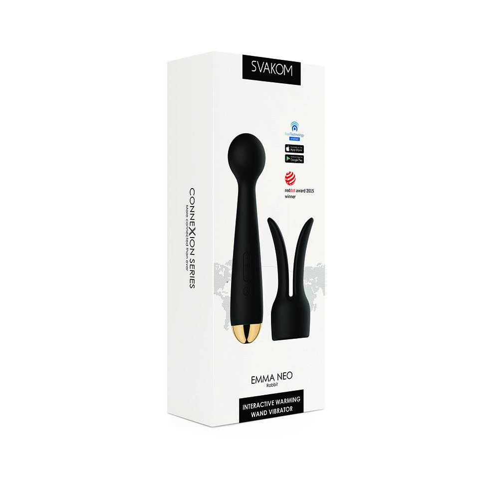 Svakom Emma Neo is a powerful, warming, and interactive wand vibrator with a sexy design and detachable bunny ears to use to stimulate your ears, neck, nipples, and any other sensitive area that needs attention. Get creative, and take foreplay to a new level of fun, with its flexible head and ultra-soft texture that gives you the tender touch that you deserve. A built-in heating core warms up the vibrating wand up to 38°C, so you can enjoy a deliciously hot session, even in the coldest winter. Best of all, Emma Neo is integrated with SVAKOM's Intelligent Mode: a unique setting that takes you on a wonderful sex tour, from bashful foreplay to multiple climaxes, all with the single touch of a button.