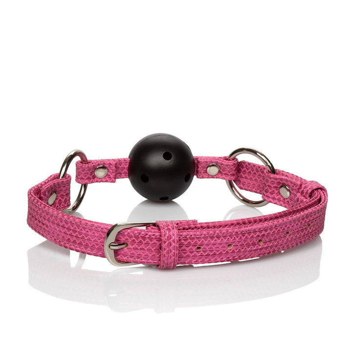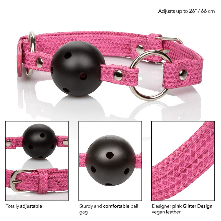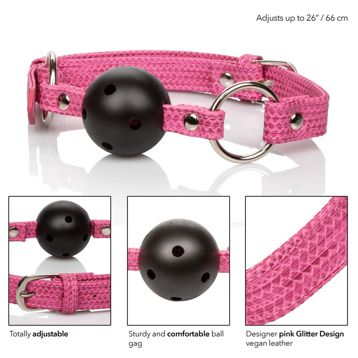 Tickle Me Pink™ Ball Gag is a sparkling erotic accessory perfect for couples looking to experiment with erotic restraint play or stylish fetishists looking to indulge designer desires. Surrender to your naughtiest fantasies as you secure the pliable gag and designer vegan leather straps.