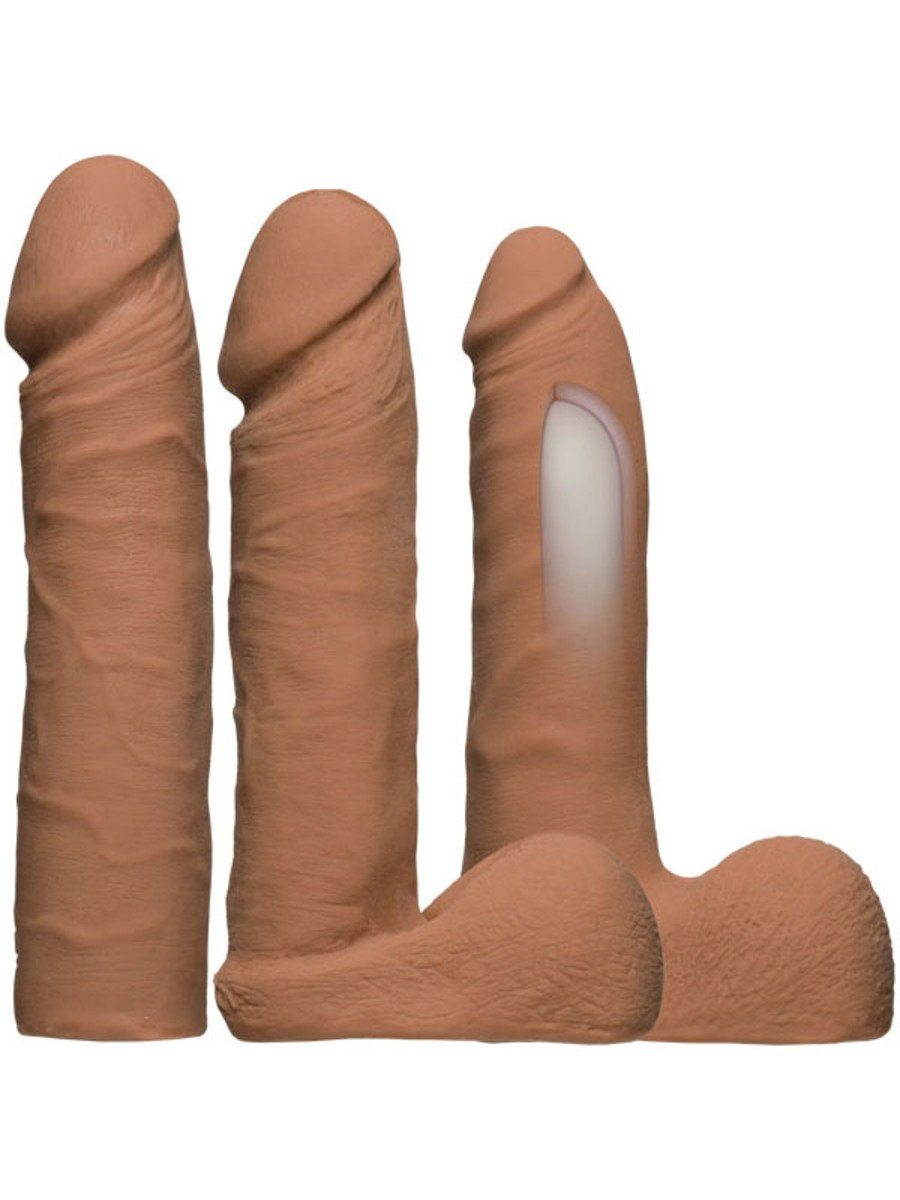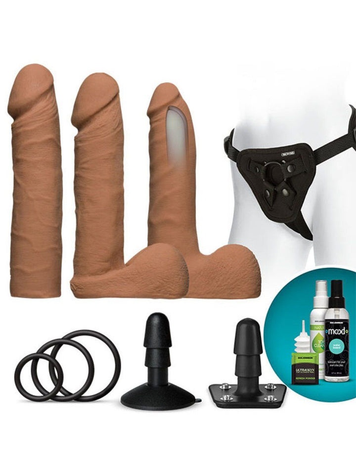 The Vac-U-Lock Dual Density ULTRASKYN™ Set is a solid investment for upgrading or beginning your strap-on accessories collection, offering multiple options in one box via a complete harness with removable o-rings and plug, three ULTRASKYN™ attachments, and a bottle of Mood water-based lube. These lifelike dual density attachments—an 8” Realistic Dong, a 7” Cock, and the bestselling 7” Slim Cock-- warm to body temperature with use and feature a soft, pliable exterior that gives way to a firm inner core, recreating the feel of a real erect penis.