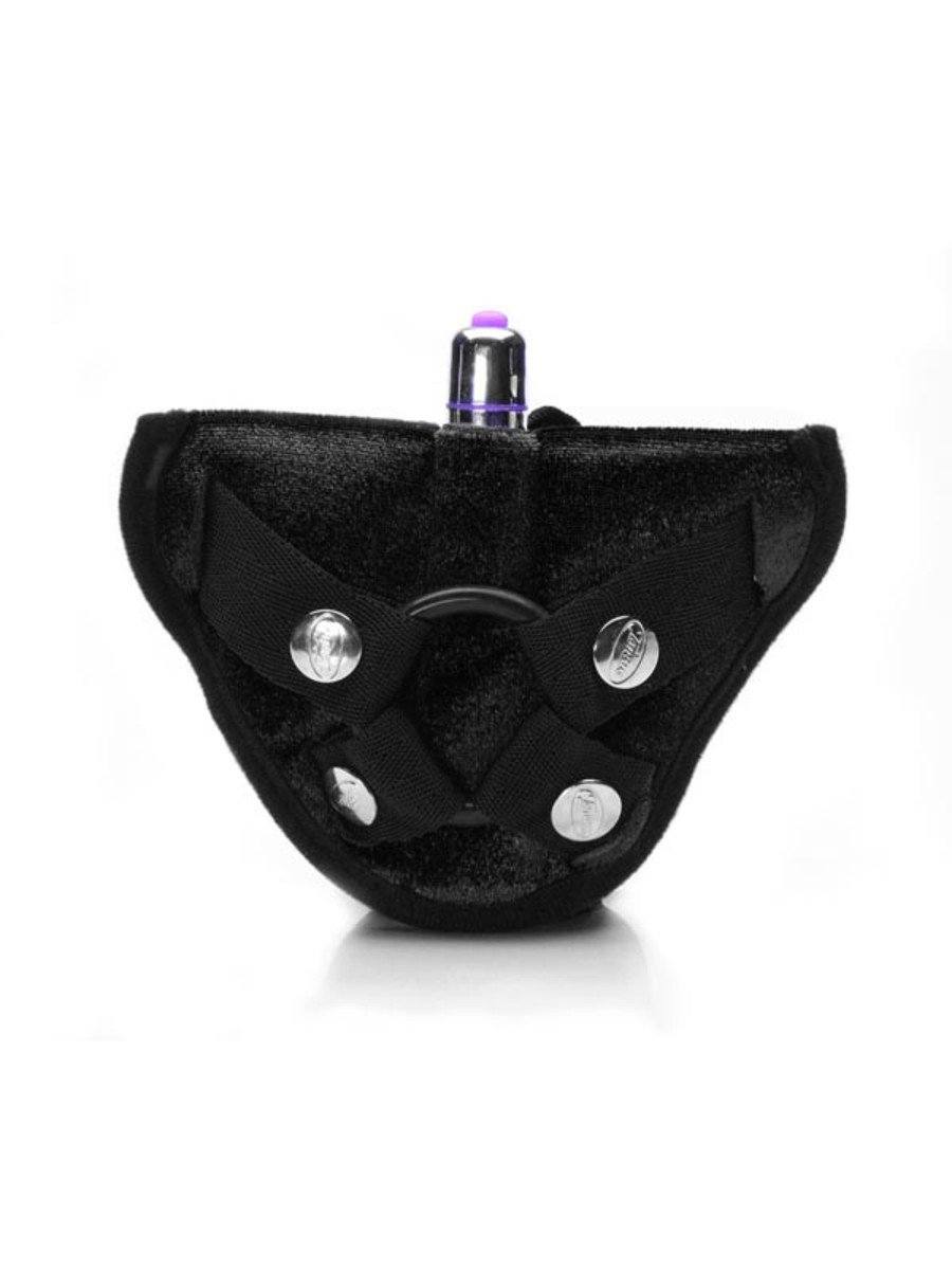 Tantus' Vibrating Harness is the perfect accessory for beginners. The soft velvet material is soothing and sensual on the body, while the adjustable two-strap design allows for a customized fit providing maximum comfort and satisfaction. Tantus' Vibrating Harness also comes with a removable O-ring, accommodating different size toys for different levels of experience, and a waterproof One Touch Bullet Vibe for extra stimulation.